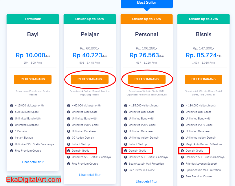 Yang pasti, jangan pilih paket Bayi karena gak ada gratis domain.