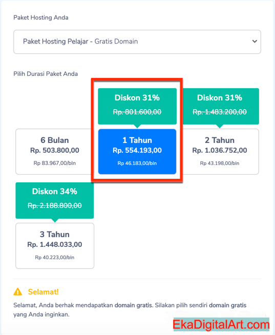 Di tutorial ini saya memilih paket hosting Pelajar durasi setahun
