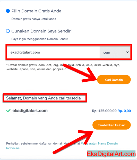 Jika nama domain anda bisa didaftarkan, akan muncul tulisan “Selamat, Domain yang Anda cari tersedia”