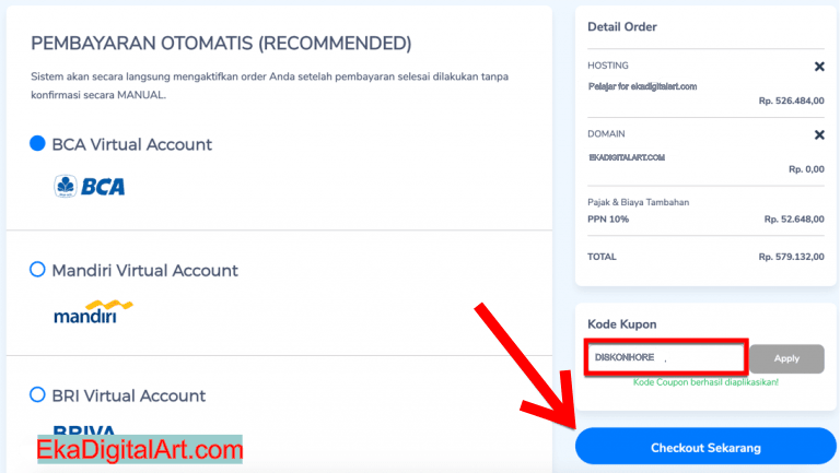Pada kolom kupon, masukkan : DISKONHOREÂ agar anda bisa mendapatkan diskon tambahan 5%. Klik Apply